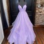• Purple V Neck Lace Prom Dress with Corset Back Formal Evening Dresses